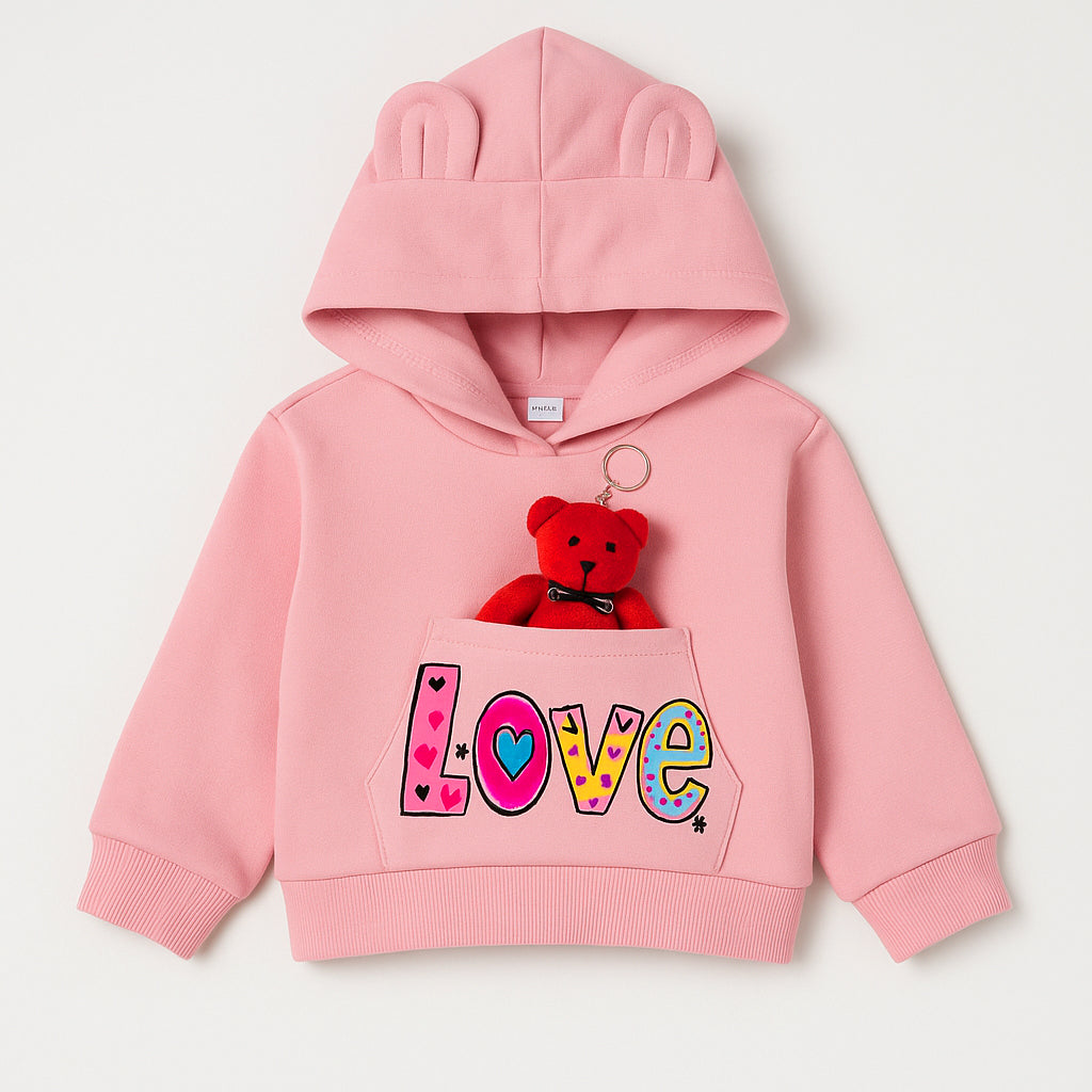 Wrap your little one in warmth and love with the Love Bear Hoodie — the cutest winterwear from Popchie’s designer collection!This soft pink hoodie comes with a tiny red teddy plushie tucked inside the front pocket and cute bear-ear detailing on the hood, making it a must-have for cozy, adorable winter days. ✨ Features: ✅ Warm Fleece Fabric: Keeps your child snug and comfy in chilly weather ✅ Adorable 3D Teddy Plush: Detachable soft toy adds playfulness and charm  ✅ “LOVE” Embroidered Design: Vibrant and cheerful front pocket print 💕 ✅ Bear Ear Hoodie: Makes every outfit picture-perfect ✅ Unisex Fit: Ideal for both boys and girls (Ages 1–10 Years) Perfect for playdates, family outings, or gifting — this hoodie spreads love and smiles everywhere it goes! 💗 ✅ Random Coloured Bear on the Hoodie will be shipped as per availability. 🛍️ Available now at Popchie Store, Connaught Place & Online at Popchie.com